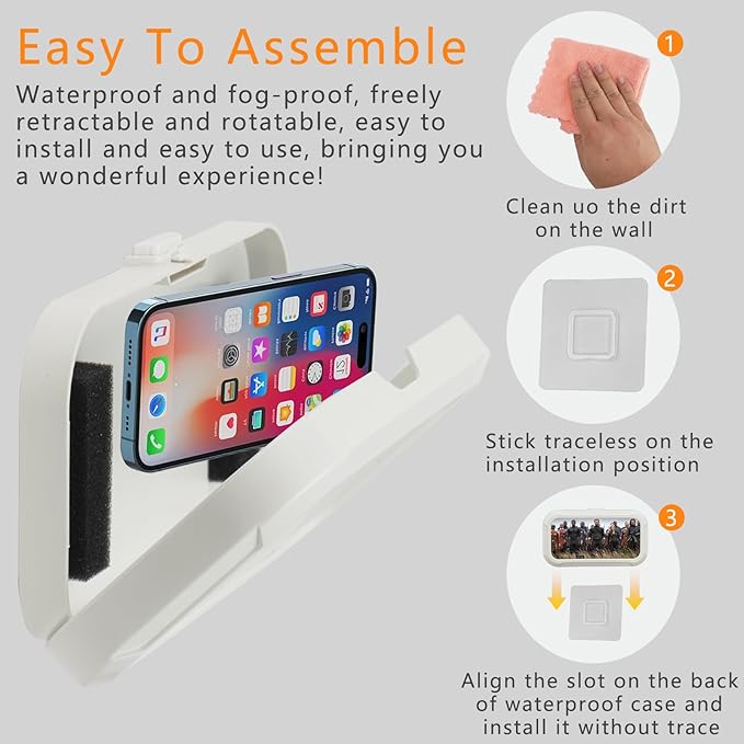 - 【Easy Installation】This waterproof phone holder is equipped with a strong adhesive wall hook, so there is no need to drill holes or damage the wall. This mobile phone box can be firmly fixed on various clean and dry surfaces, saving the space on the table and making your mobile phone at your fingertips. The installation process is simple and comes with all necessary hardware