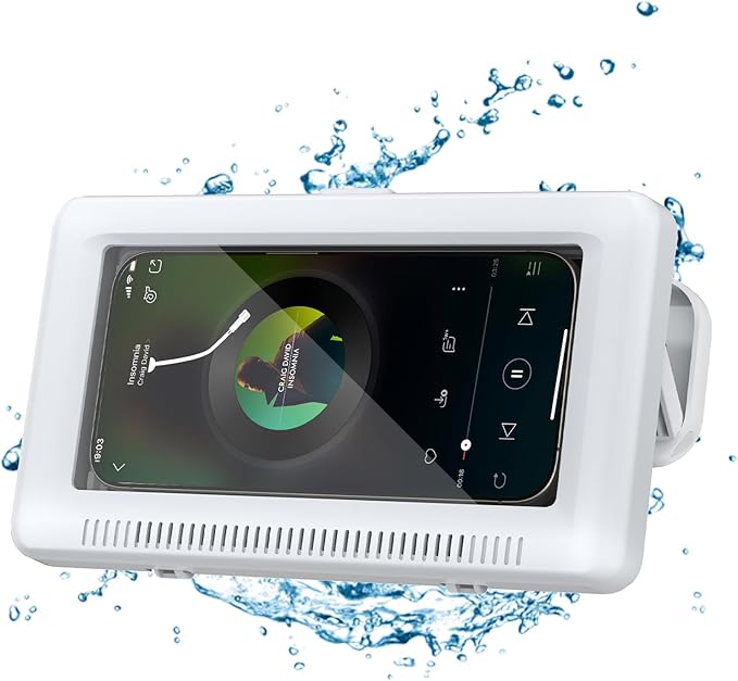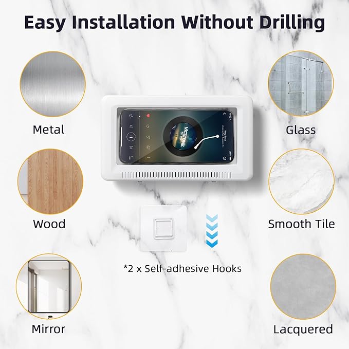 - All-Round Waterproof: The phone holder for shower adopts a full-inclusive design with a built-in waterproof silicone strip, which can effectively prevent water droplets from sliding into the phone holder. At the same time, the waterproof phone holder adopts an adjustable design. When using it, adjust the holder to a tilted state, so that water droplets can easily slide off and protect the mobile phone from water damage.